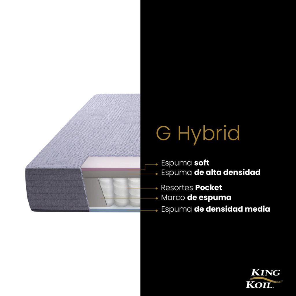 Diseñado para quienes buscan practicidad, el modelo G-Hybrid de King Koil, viene en caja y es sinónimo de confort. Su interior incorpora resortes Pocket enfundados individualmente que disminuyen la transferencia de movimiento al dormir de a dos. La exclusiva combinación de espumas soft y de alta densidad, garantizan una estabilidad superior y adaptabilidad única.